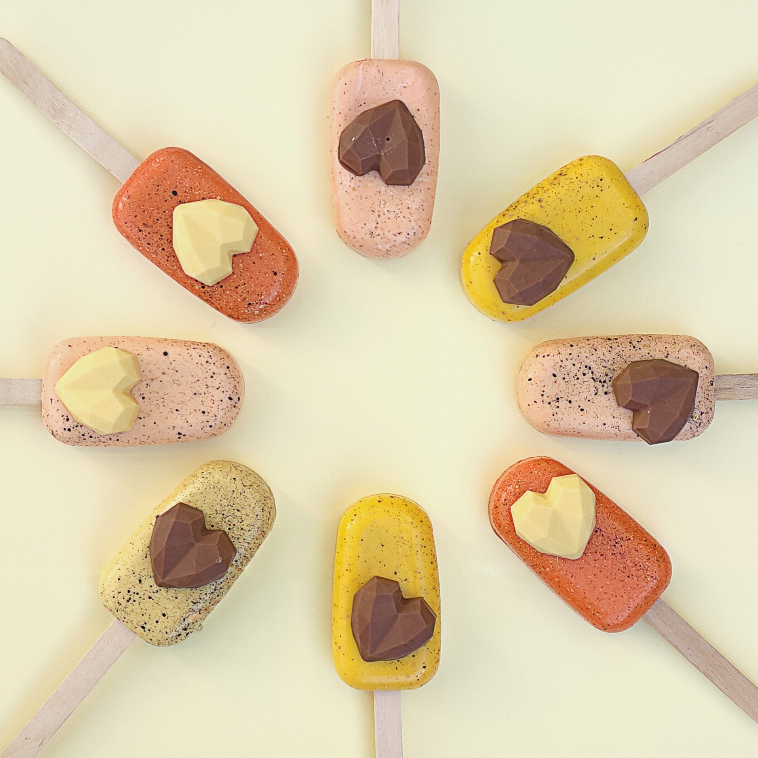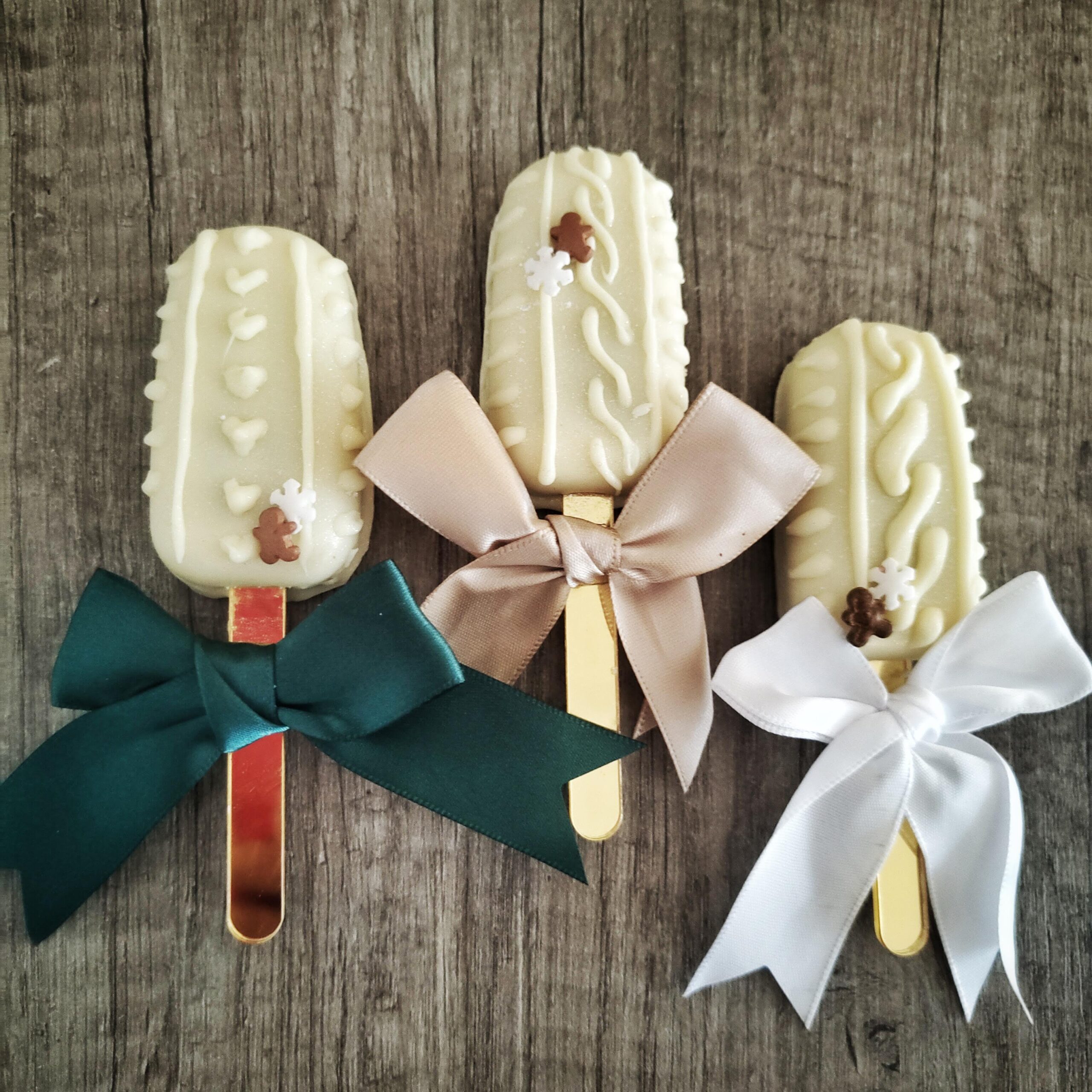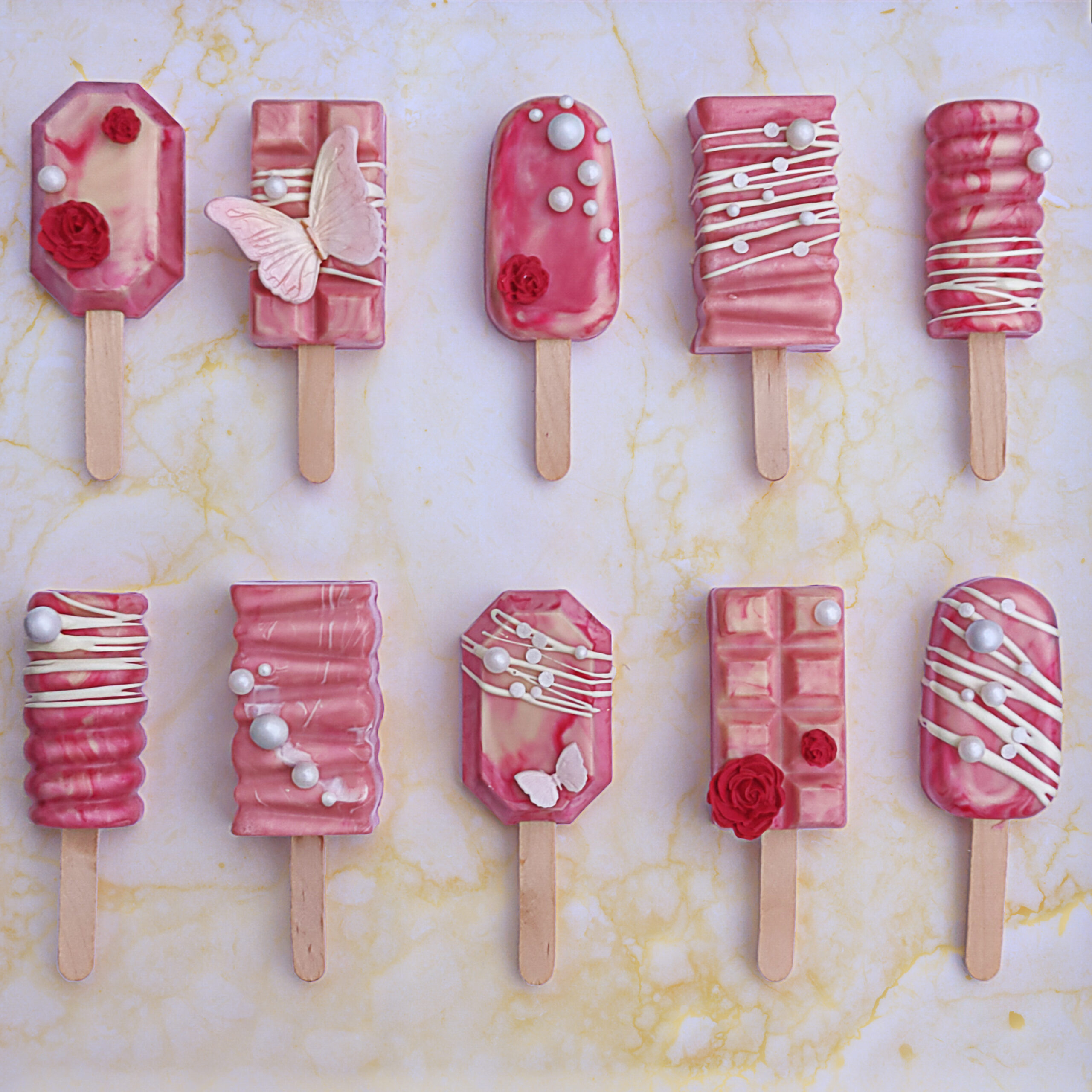 Cakesicles zijn cakejes op een stokje omhuld met witte chocolade, die vaak gekleurd wordt.